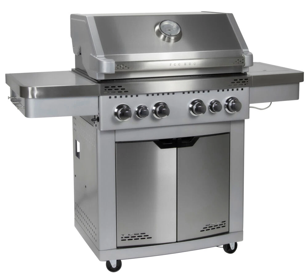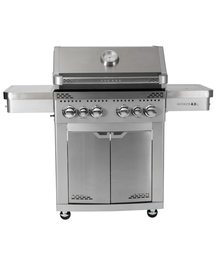 FCC BBQ Ultimate 4.2 gassgrill har 4 brennere i stainless steel, keramisk bakbrenner og en vanlig sidebrenner. Grillen har en grillflate på 71×49 cm + varmehylle og kommer med kraftige grillrister i emaljert støpejern inkludert MGS system. MGS systemet gir mulighet for variert grilling av alle typer råvarer. Tilbehør til MGS systemet selges separat. Leveres med bak-brenner, ypperlig for bla grilling med roterende grillspyd. Sidebrenner for tilbereding av tilbehør, saus etc. Grillen har integrert tenning for hovedbrennerne, samt puls tenning for bakbrenner. Stort termometer i lokket og en stor varmehylle. Lokket er i stainless steel og støpt aluminium. Underskapet og sidebordene er i stainless steel og lakkert stål.. 4 låsbare hjul som gir god stabilitet.