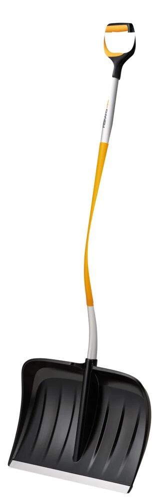 Fiskars snømåke ergo X-series. Skaftet er utformet for å minske belastingen på muskler og ledd. Skaft i lettvekst aluminium og stort D-håndtak med SoftGrip belegg. Plastblad med aluminiumskinne som er forsterket med stål for lengre holdbarhet.