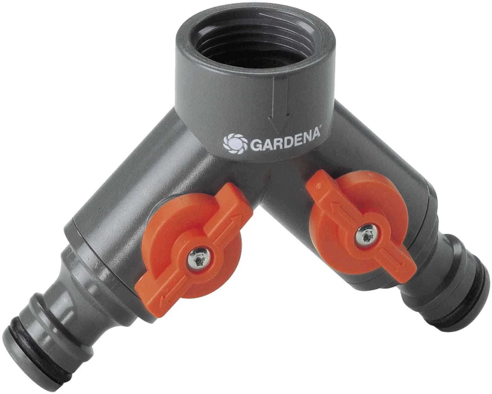 GARDENA 2-veis krankobling muliggjør bruk av to tilbehør samtidig. begge uttak er individuellt justerbare. GARDENA 2-veis krankobling passer for kraner med 26.5 mm (G 3/4″) og 21 mm (G 1/2″) gjenger.