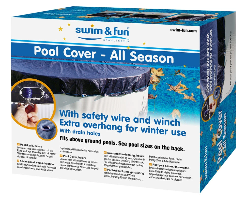 Vårt vintertrekk (helårstrekk) er fremstilt i en ekstra kraftig dobbeltbelagt 120 gr/m2-kvalitet med marineblå overside og svart underside. Trekket leveres med sikkerhetswire og spennlås, slik at uvedkommende ikke har atkomst til bassenget.